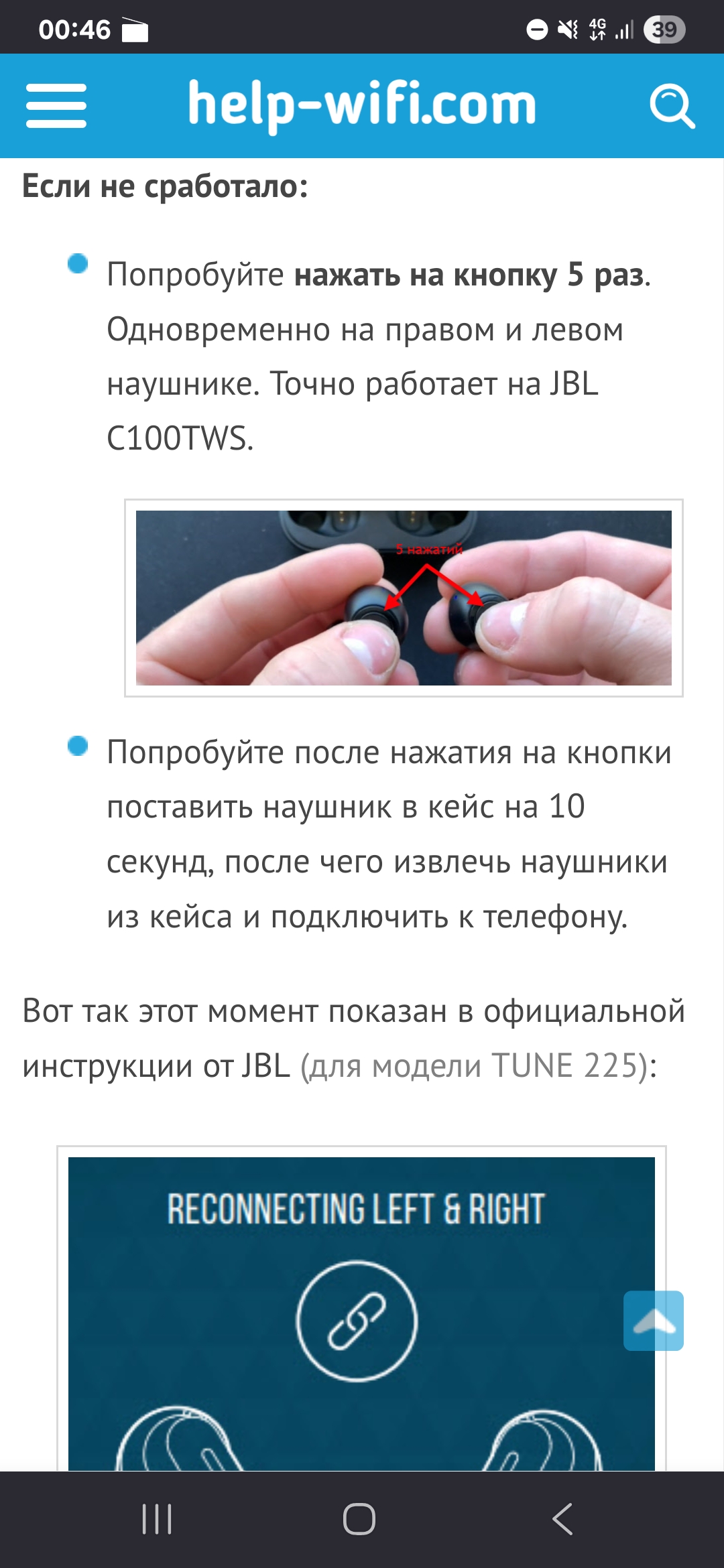 Добрый день. Левый наушник JBL TUNE230NC TWS сначала подключается работает около 10 секунд, а затем отключается. При этом правый продолжает работать в режиме моно, а левый наушник уже не видит ни приложение ни телефон. Если поместить оба обратно в кейс и вытащить – вся история повторяется. Индикаторы мигают Сначала все работает, но через 10-15 секунд левый «отваливается». Отваливается как при воспроизведении музыки так и просто вытаскивании из кейса. Пробовал Ваши способы – не помогло. Пробовал глубокую разрядку тоже не помогло.