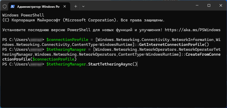 (если в итоге будет ошибка при запуске, то можете попробовать старый код: PowerShell C:\ScriptsHotsPot\MobileHotsPot.ps1)