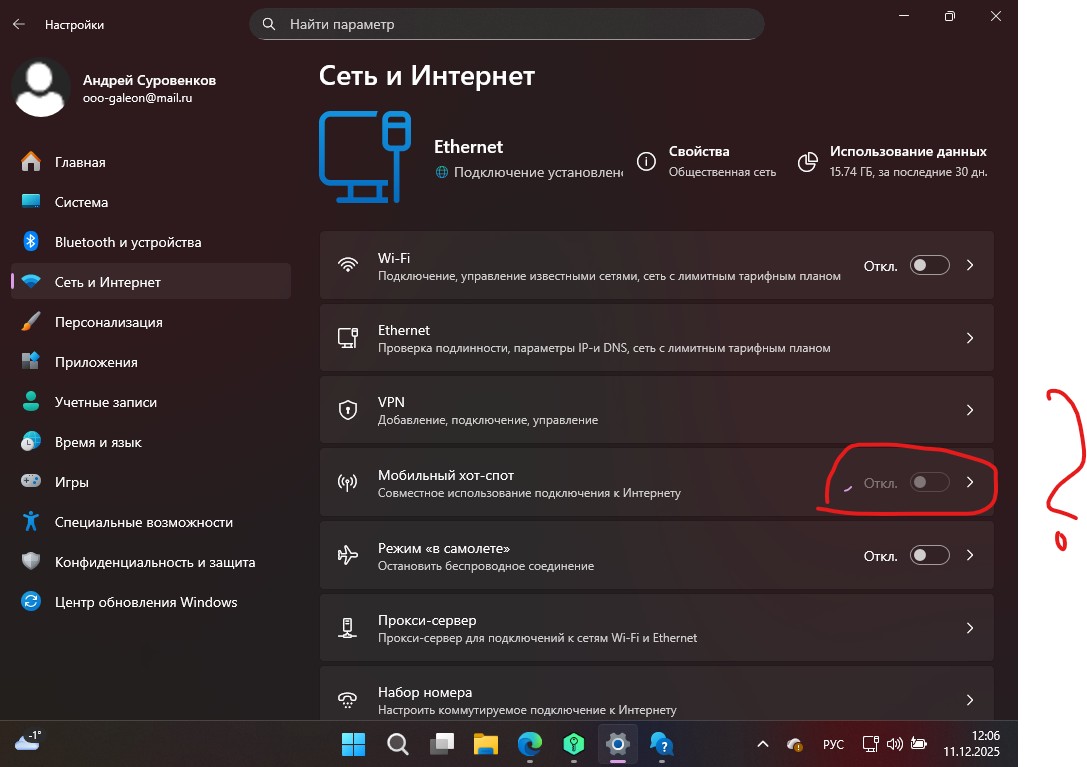 Подскажите, а как включить просто хотспот на 11 не имея интернета, хочу просто связать смарт с ноутбуком, что это можно я точно знаю, так как делал ,, но это муторно и теряет смысл, там надо создать в начале точку доступа на смартфоне, подключиться с ноутбука, тогда актевен переключатель включения хотспота, потом переподключаешься и т д