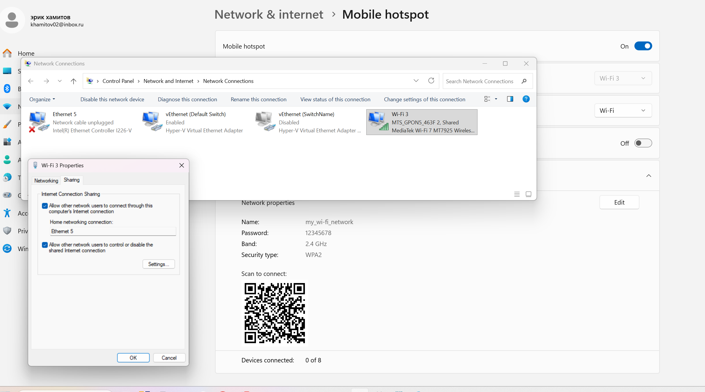 Зачем открывать общий доступ в свойствах соединения «Беспроводная связь»? Зачем вообще открывать вручную общий доступ, ели вы хотите настроить хот-спот. Или вы через командную строку настроили раздачу?