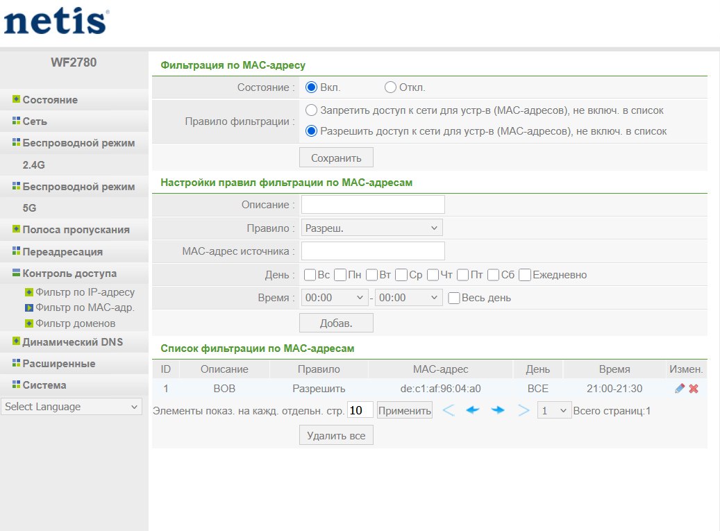 простите не указал. роутер нетис 2780 . вставляю мас адрес в значение разрешить. но устройство в списке все равно работает