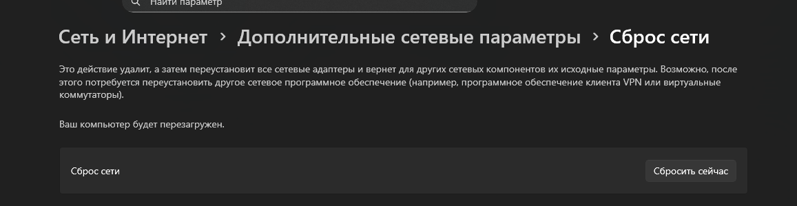 Сделал сброс сетевого адаптера в настройках сетевых. дополнительные настройки и там будет вкладка сетевой сброс…
