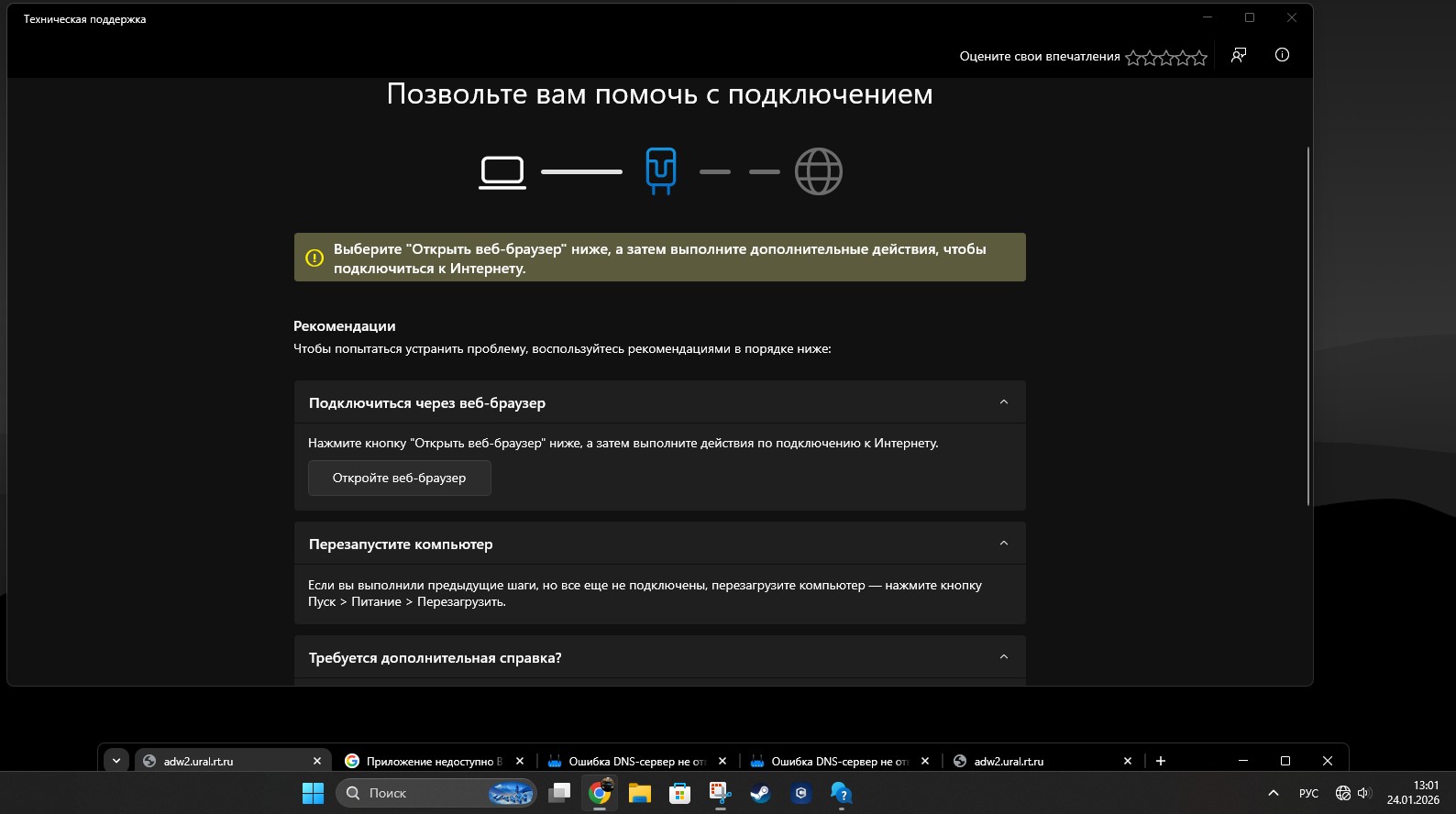ПК по кабелю к роутеру подключен? В какие моменты и где пишет о проблеме с кэшем DNS? VPN не установлен?