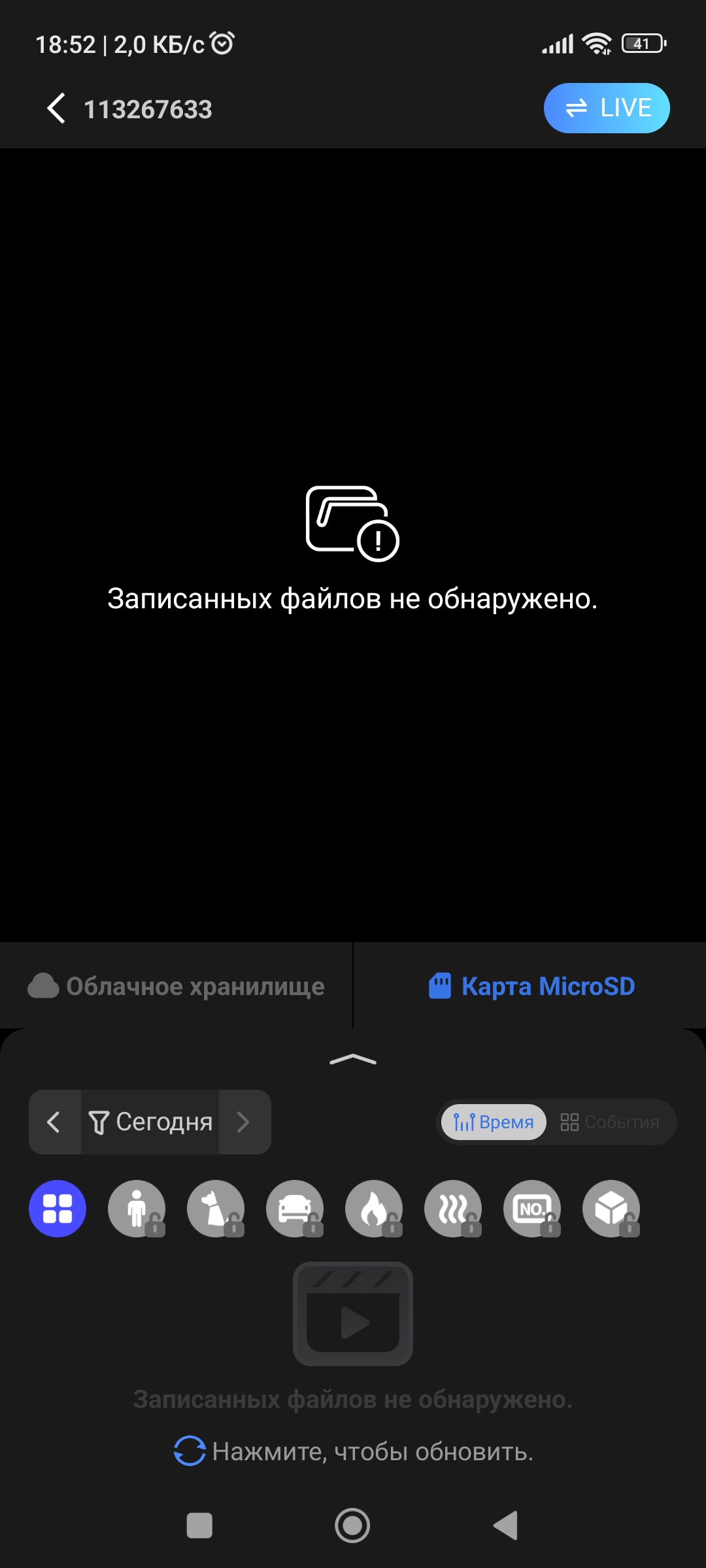 В общем, после перезапуска камеры запись продлилась те же пару часов. И опять сообщение об отсутствии записанных файлов.