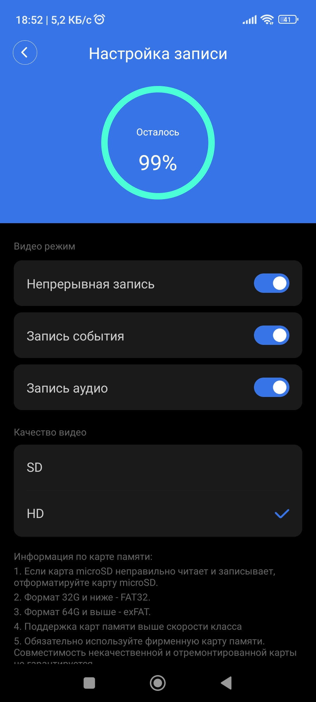 Там же есть настройки качества видео. У меня доступны два варианта: SD и HD. В SD качество хуже, в HD лучше. Но HD больше места занимает на карте памяти, соответственно меньше записей поместится. Ниже, после рекомендаций по файловой системе карты памяти есть кнопка для форматирования карты памяти (удаляются все записи).