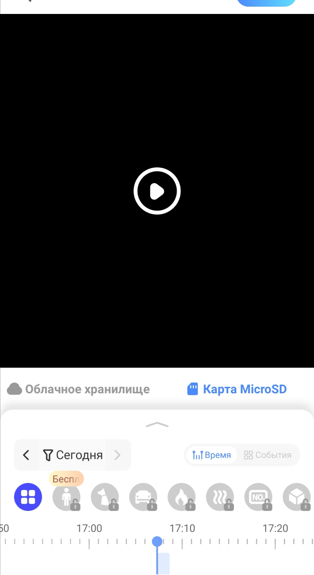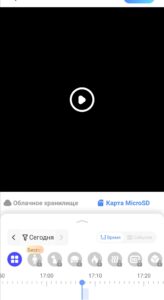 В этом разделе нужно переключиться на вкладку Карта MicroSD. Ну или смотреть на вкладке Облачный сервис, если вы его оплатили и ваша камера пишет в облако. Все записи, будь то постоянная запись, или запись по движению (они отличаются цветом) отображаются на временной шкале. Ее можно увеличивать для удобного просмотра (как вы приближаете и отдаляете фото на экране телефона).