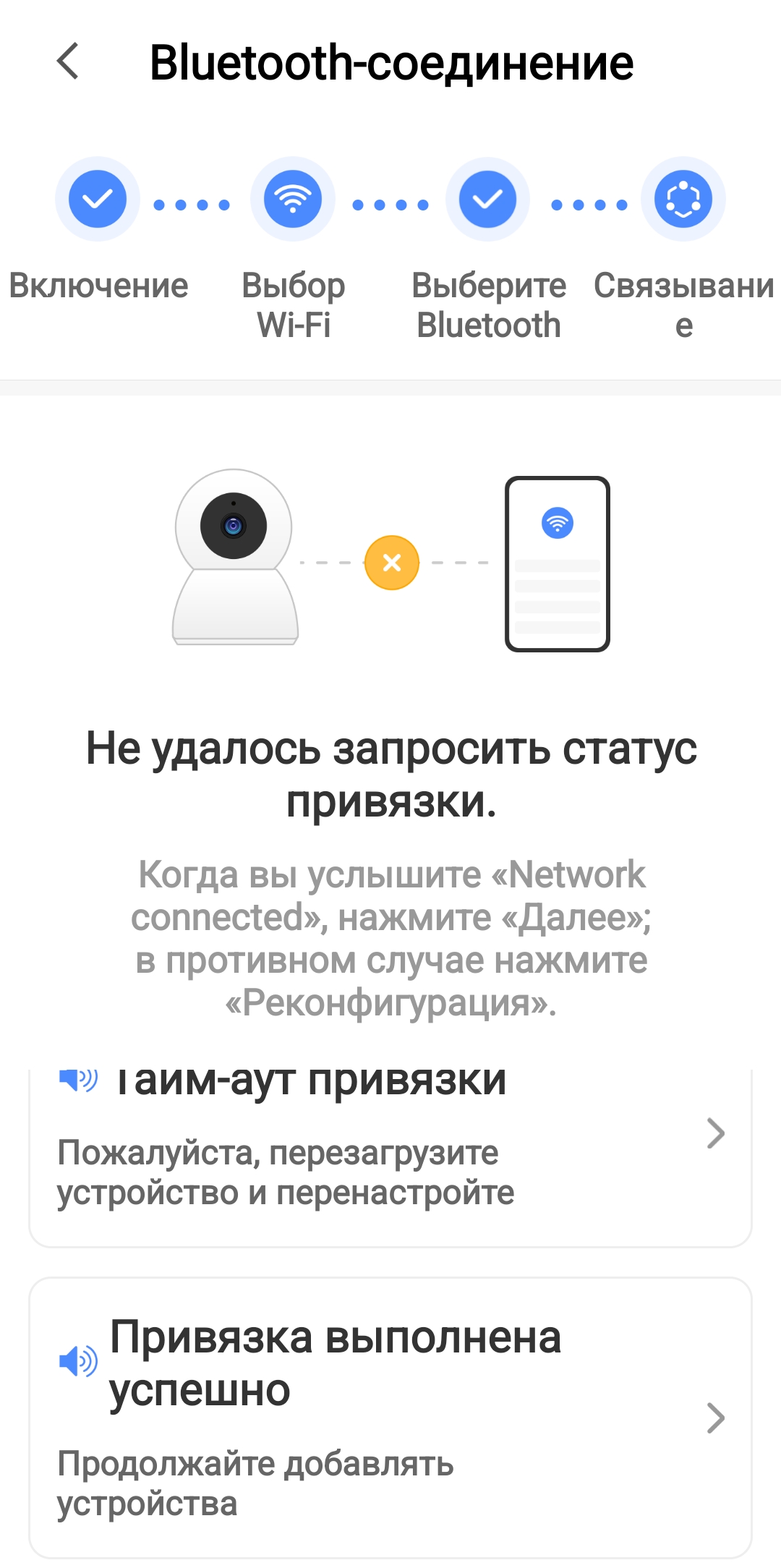 Вопрос, при добавлении (любым способом) камеры, на последнем этапе пишет — не удалось запросить статус привязки. В чём проблема? Скан прикрепляю.
