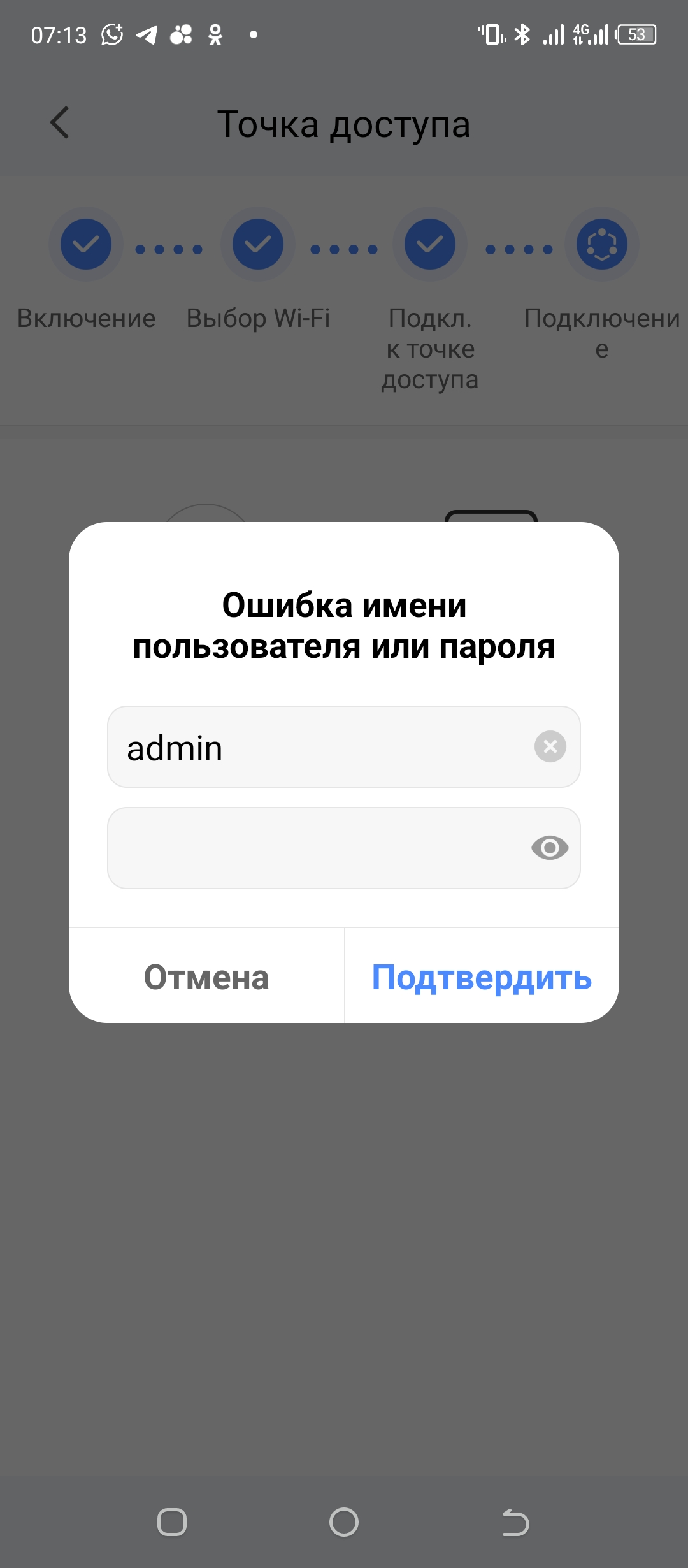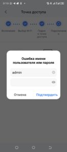 Доброе утро! Последовательно подключаю точку доступа, затем возвращаюсь в приложение для настройки, но там при сопряжении камеры с телефоном выдается ошибка имени пользователя или пароля. Какой там пароль я так и не нашёл, или я что-то не так делаю? Заранее спасибо